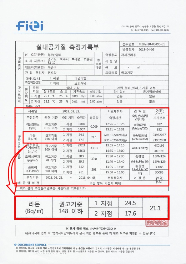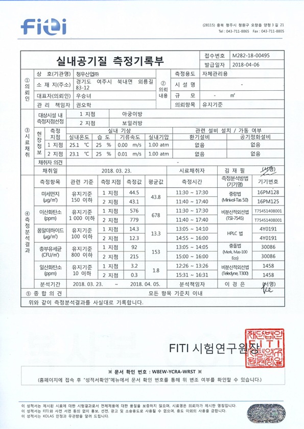 동년 KCL에서 실내공기질 10종목[라돈포함]받았으며