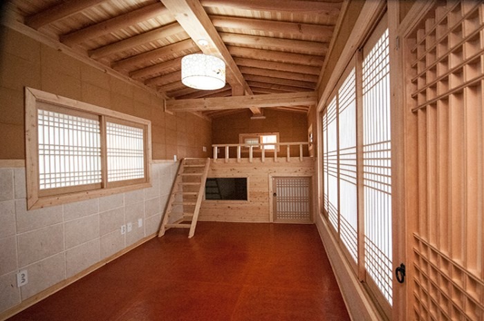 천정은 한옥도편수님들께서 서가레+원목보 봉순이韓紙작가님의 한지등.맞은편에는 화장실+주방윗부분을 발효실 공간으로~