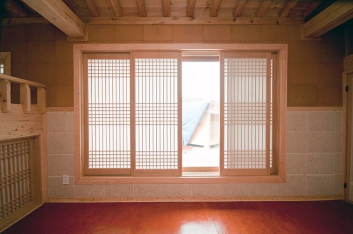 출입문은 우리의 한실문과 황토방을 볼수있도록 유리창~